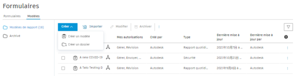 - Pour faciliter la mise en route, Autodesk Build inclut un jeu de modèles de formulaire préconfigurés. Vous pouvez également importer des modèles ou en créer de toute pièce.