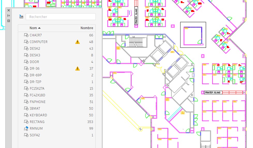 La Palette Nombre affiche le nombre des blocs disponible dans le dessin. Parfois certains blocs sont identifiés avec des symboles différents (point d’exclamation, étiquette bleue).