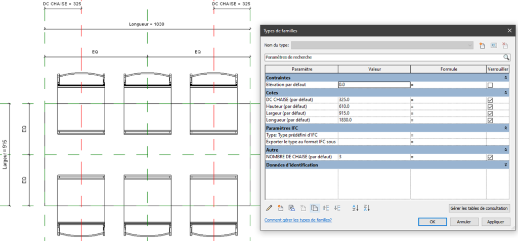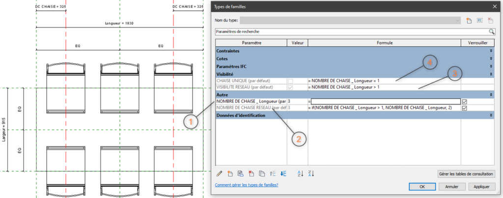 Il permet aussi de gérer le problème suivant : le réseau doit être supérieur ou égal à 2. En dessous de la valeur de 2, Revit ne peux plus créer le réseau. Il faut donc lui imposer la valeur 2 si le « NOMBRE DE CHAISE » est égal à 1 ou 0. Pour cela on utilise la condition « IF » pour foncer le réseau à 2 en cas de valeur inférieur.