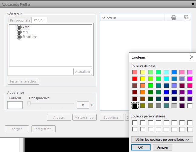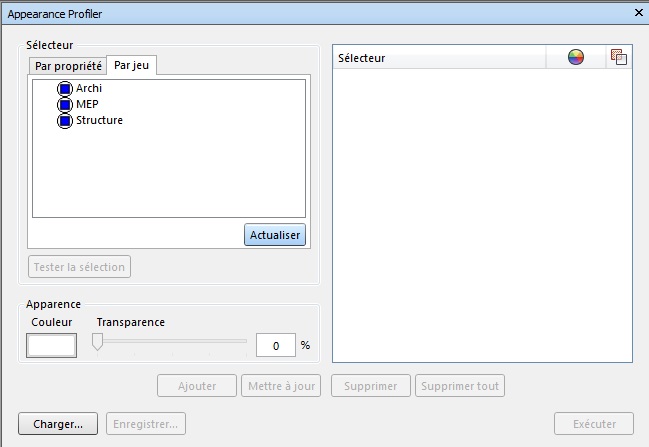 Nous allons voir dans cet article comment colorer les différentes maquettes (Archi, MEP et Structure) d’un projet pour une meilleure visibilité lors de notre travail de synthèse grâce à l’outil Appearance Profiler . Dans un premier temps, il faut créer des jeux de sélection. Un jeu par maquette.