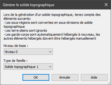 Attention : Lors de la conversion en solide topographique les terre-pleins seront ignorés. Choisir le niveau de base et le type de famille avant de valider la conversion. Puis allez dans les propriétés pour définir le matériau et créer des couches supplémentaires |